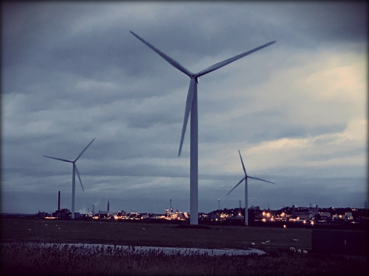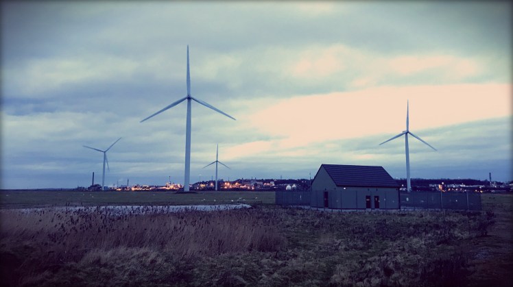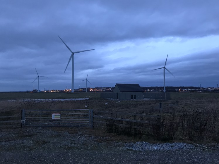 I carried on up to see how close I could get, and amazingly I got really close. At the top, I was not only treated to a grand stand view of the turbines, but also across to the old ICI plant in the distance. It’s lights are pretty, from this vantage point.