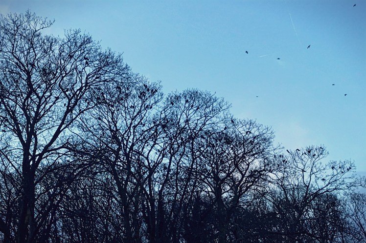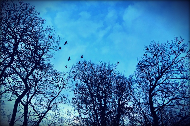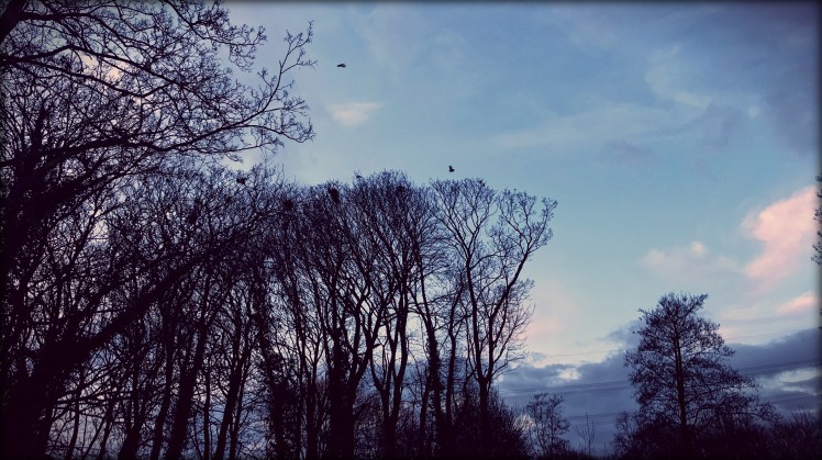 Yesterday Holly told me about a murder (a flock) of crows that roost every day just on dusk near our house, and she suggested it might make a nice photograph.