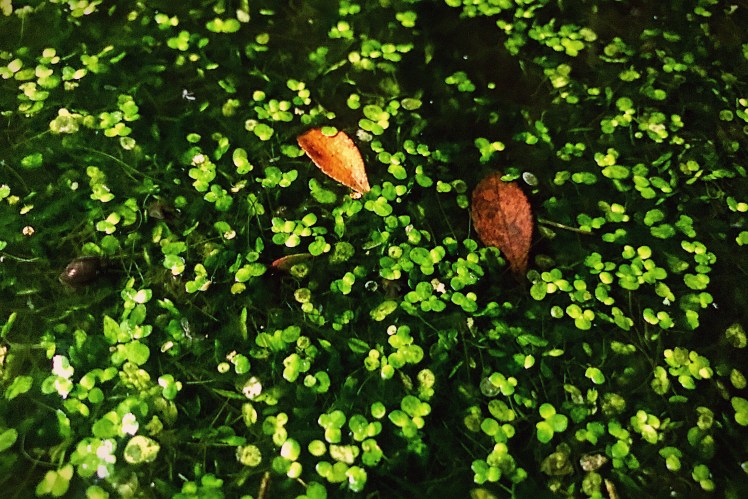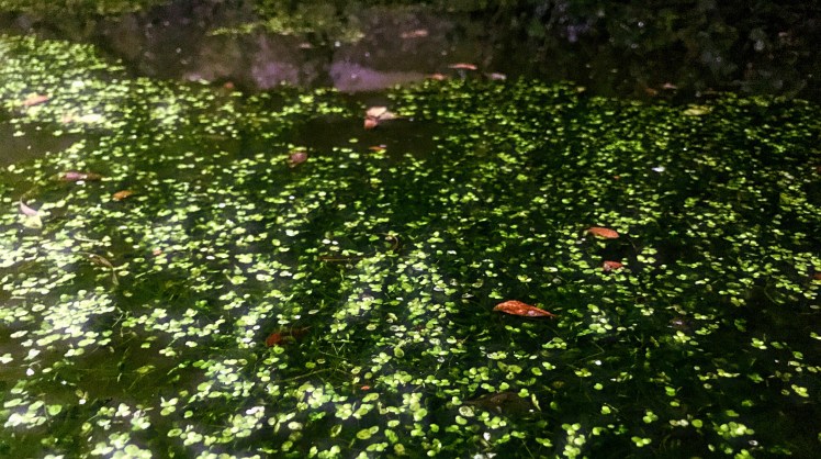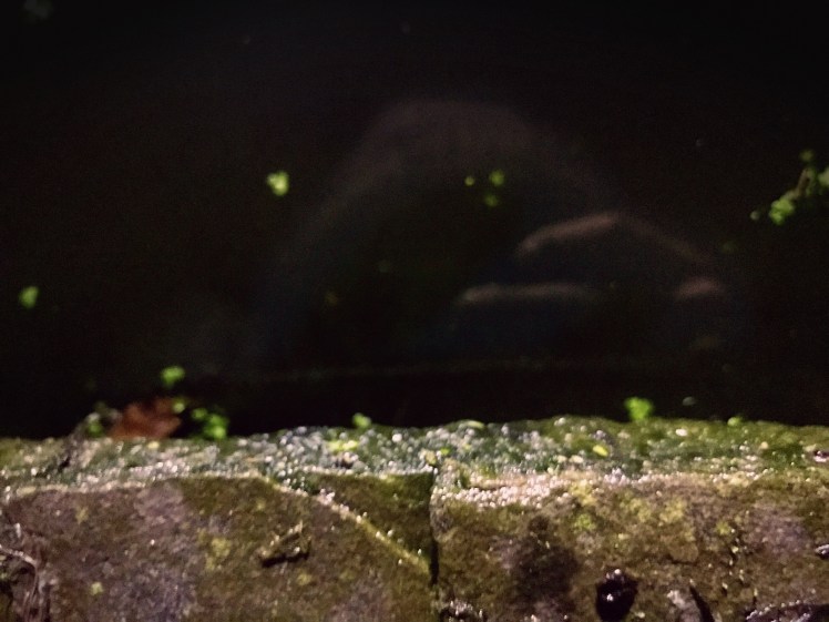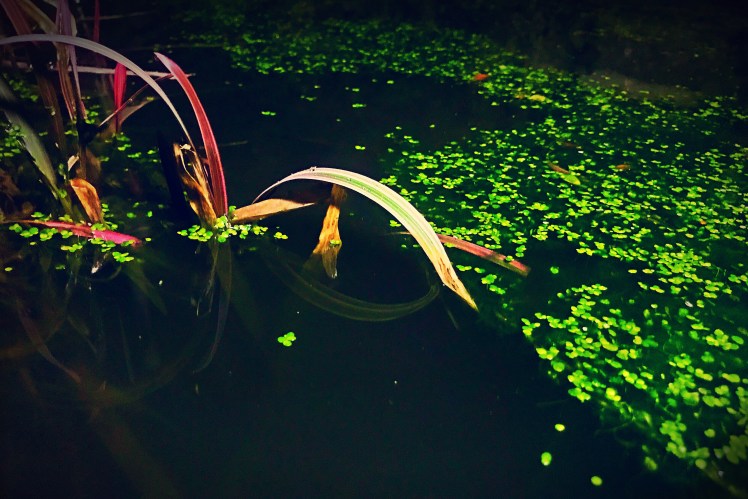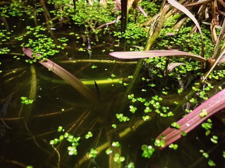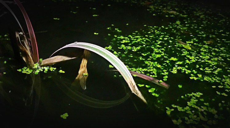 Mostly bright green duck weed, sat atop dark green water, peppered with the odd leaf, rocks, twigs, and some other aquatic plants, it all looked remarkably interesting in the darkness.