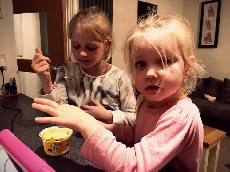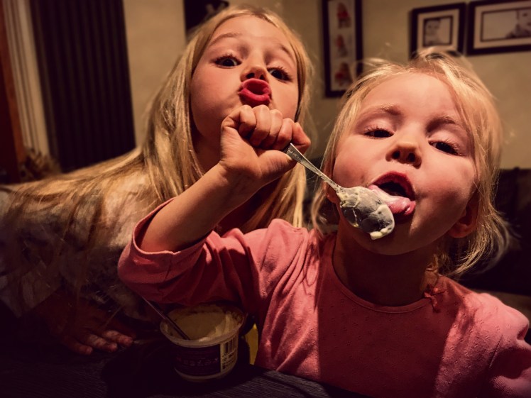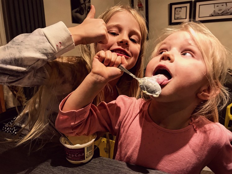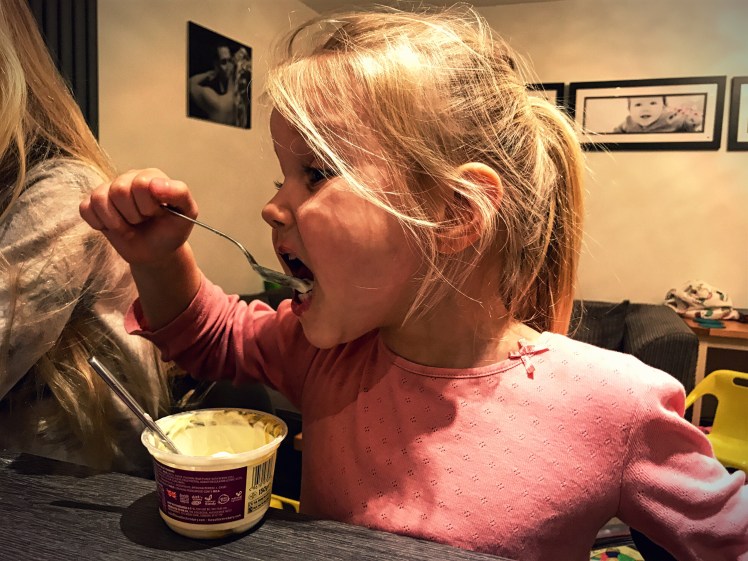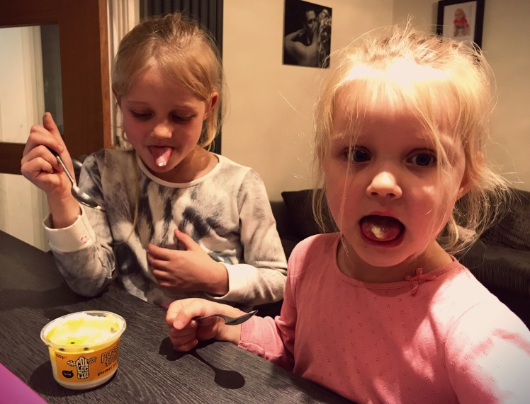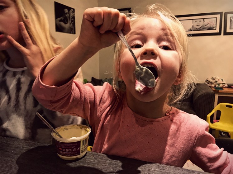 I asked the girls to blow you a kiss; one did, one couldn’t stop herself stuffing her face with yogurt!