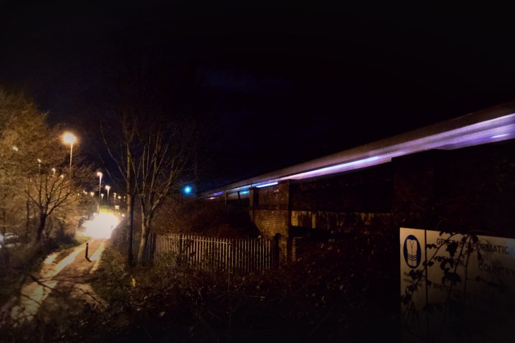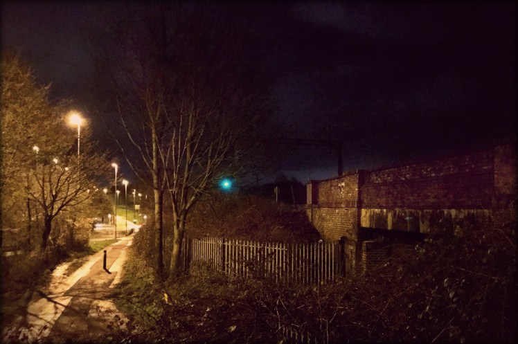 Today I wanted to try and capture an image of a train whizzing past at night. I knew the spot I could try – on the bridge where Livvy and I took the pictures for “Street Wise“.