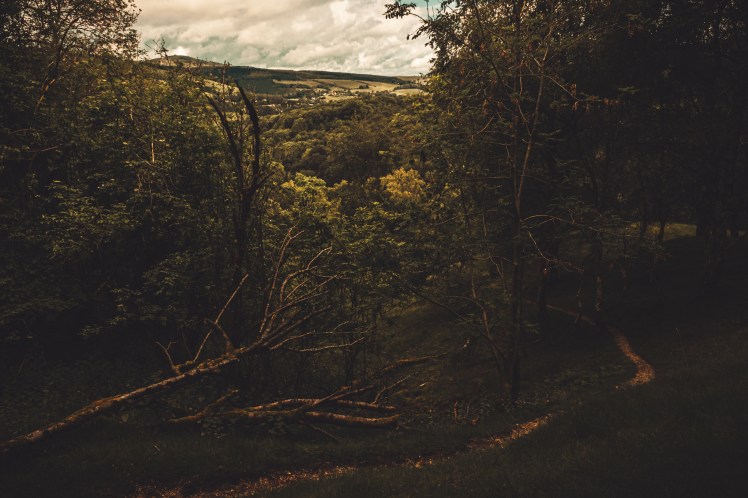 The image above, is of the tiny path we were following, wrapping itself around the woods, sat amongst the moss, with Moel Fammau in the distance.