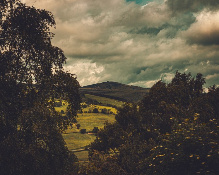 Then this one below, again with the old dry stone wall in the foreground, the hills stretching away in the mid-ground, culminating in a solitary tree and a walker making his/her way towards it, on the background horizon.