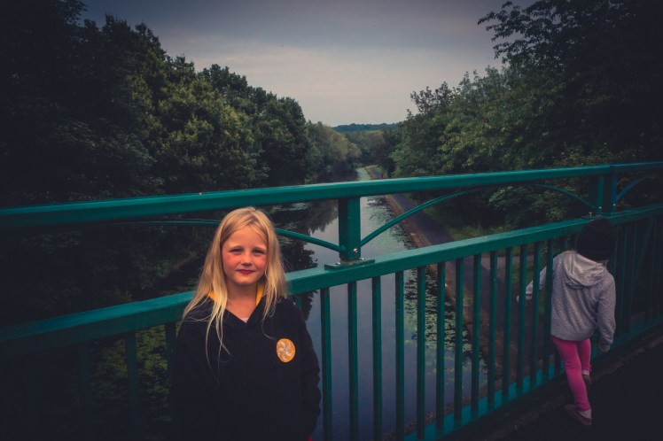 We found a little closed off road, that held a bridge over the canal. It was a good place to stop and try and get some photos; the girls would be safe as no cars could get to where we were, and the view was really cool down the canal, and over to the woodland in the distance.