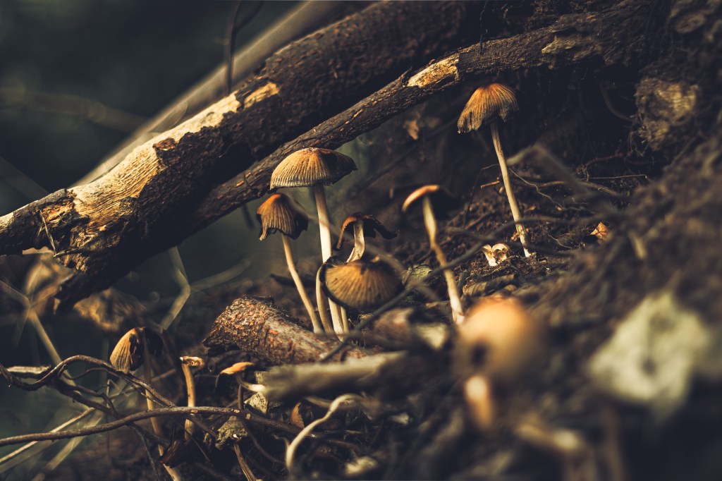 Sure enough, after we’d scrambled down the bank, the ground felt softer under foot, much more like mushroom territory! Then, at the base of the fallen tree I saw what we were looking for, a little nest of mushrooms.