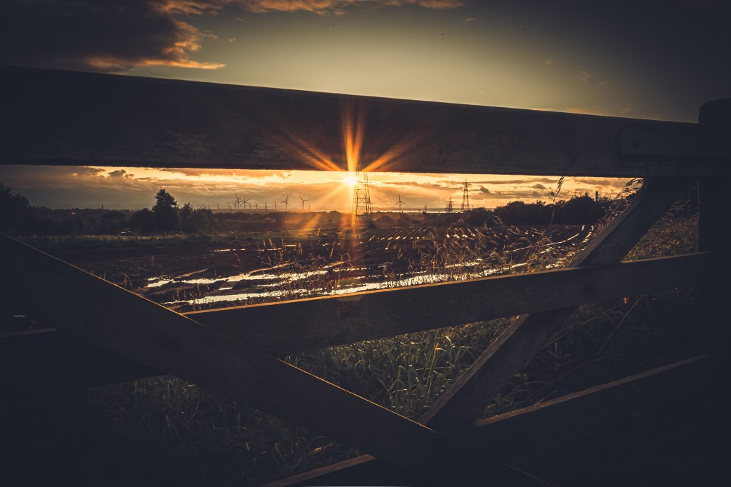 I know it breaks loads of “rules” about composition, but I really dont mind. For me, I like the way the gate frames the scene beyond, and becasue the sky behind the gate is very different to the sky above, it almost looks like a widescreen view within a more standard framing. Everything is happening through the bars in the gate, the sun, the sky, the reflections in the pools of water, the wind turbines and the telegraph poles.