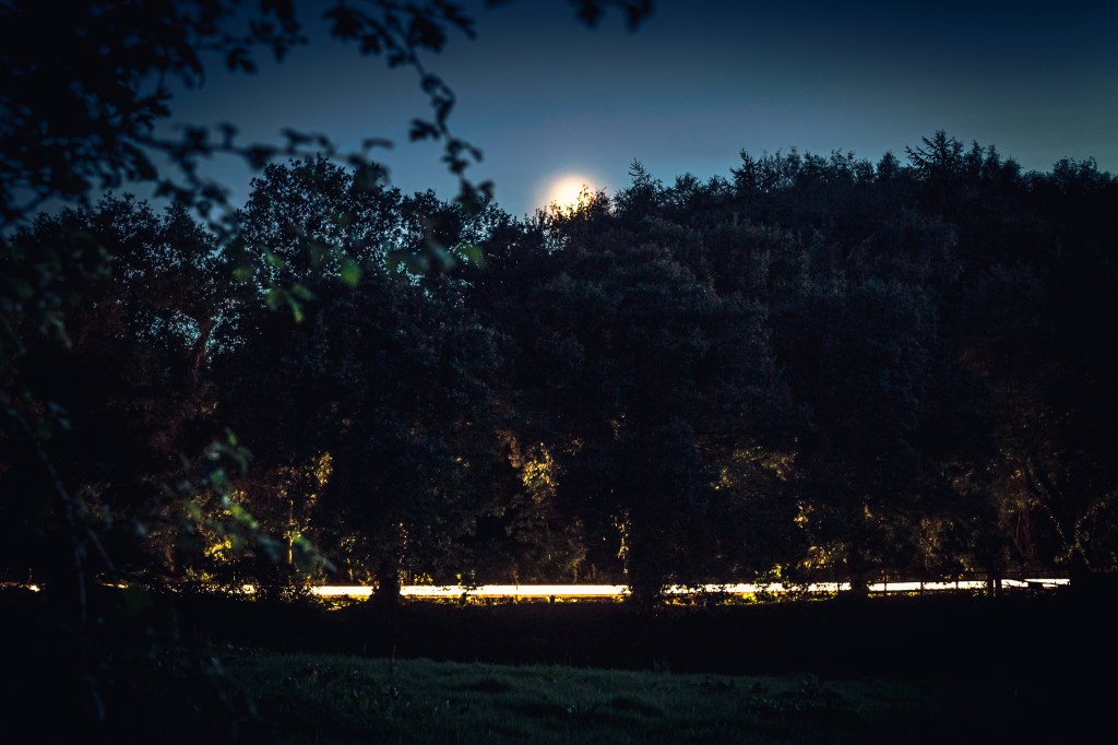 I did wonder if I could capture that single light I noticed yesterday, however it wasn’t pitch black yet, so that shot wasn’t on the cards. However the moon was just about to dip behind the trees, and with cars trundling slowly up the lane with their lights blazing, I thought that might make for an interesting composition.