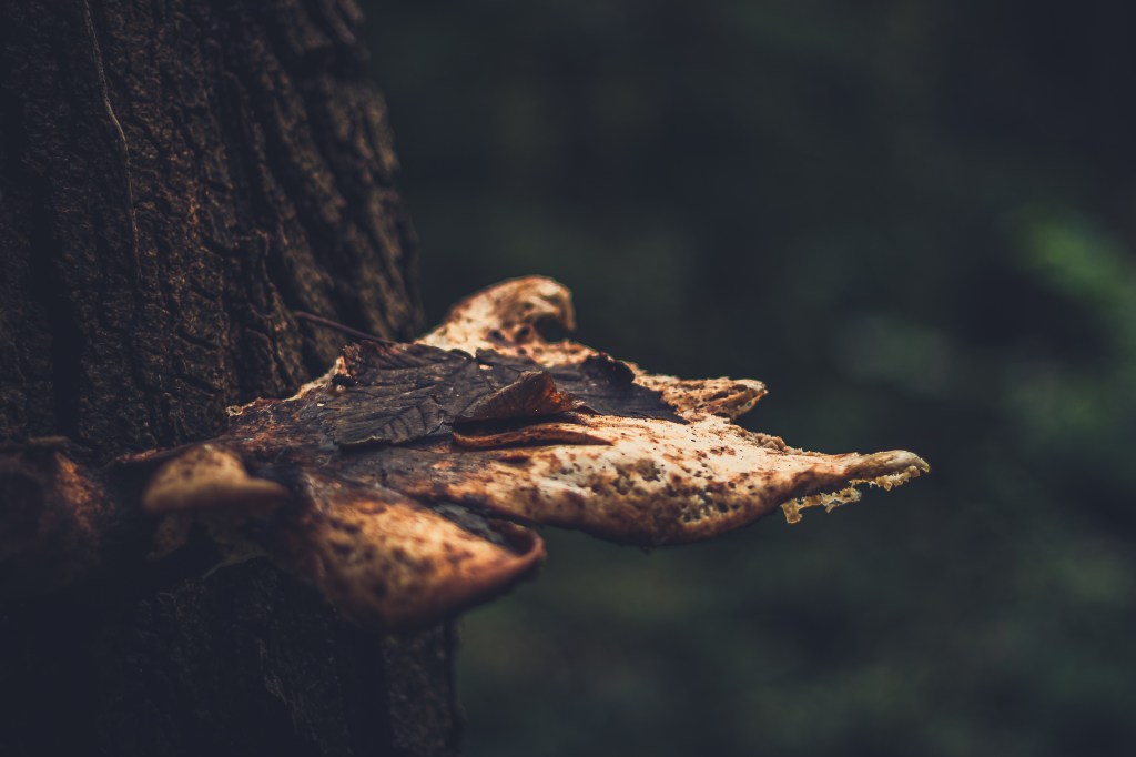 Below, the fungi is balanced with the yellowing leaf at the bottom, and both are connected by the somber, almost sinister looking Ivy, wrappig around the fallen tree. So much going on in such a tight and intimate scene; the full cycle of life, no less.