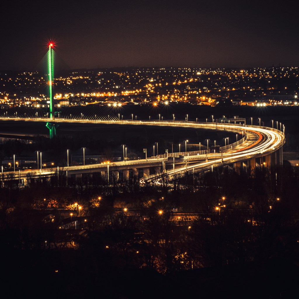 Of course I took my camera with the hope that through a foggy head I might find some inspiration for todays phorograph, and I had a rough location in mind that I thought might, just might, give me a view of the Mersey Gateway at night from above. If you remember I tried once before in the recent post “Red Connection“, but I couldn’t find a location high enough, so shot the towers in their bright red glory from a lower vantage point. Tonight the towers were blue and green, interestingly.